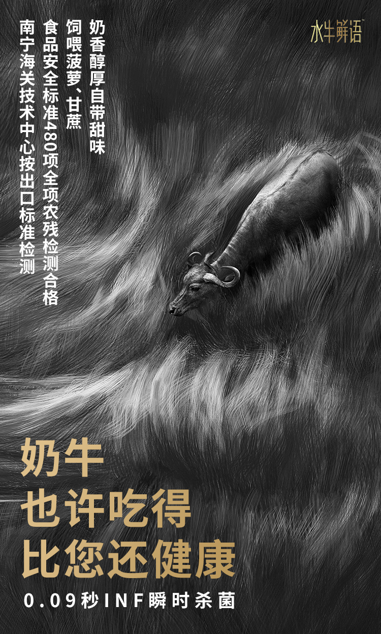 牧场位于北回归线上,物产丰饶,用甘蔗菠萝喂养的奶牛产出的奶自带甜味。水牛奶和牛奶科学配比后,奶香醇厚却不腥。水牛奶是“奶中精品”,水牛鲜语所含蛋白质高于欧盟标准约21%,含钙量远超高钙奶标准。