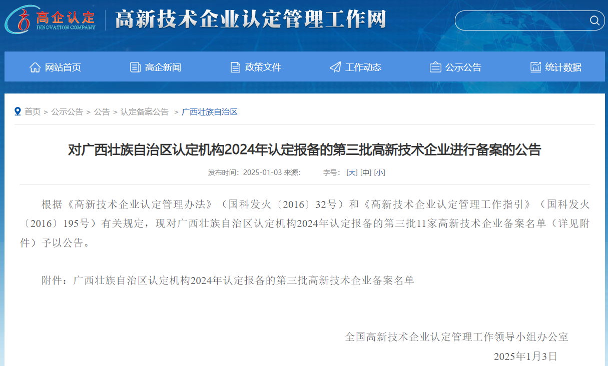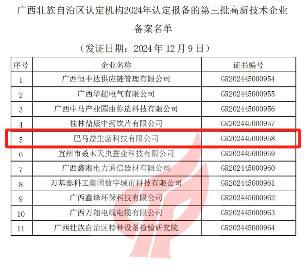 继荣获广西科学技术厅授予的“广西瞪羚企业”后,在2025年1月3日发布的《广西壮族自治区认定机构2024年认定报备的第三批高新技术企业备案名单》公告中,巴马益生菌科技有限公司成功通过国家高新技术企业认定。这是巴马益生菌公司在科技创新领域持续发力、深化布局的重要成果,标志着巴马益生菌公司整体科技实力与创新竞争力的进一步提升。