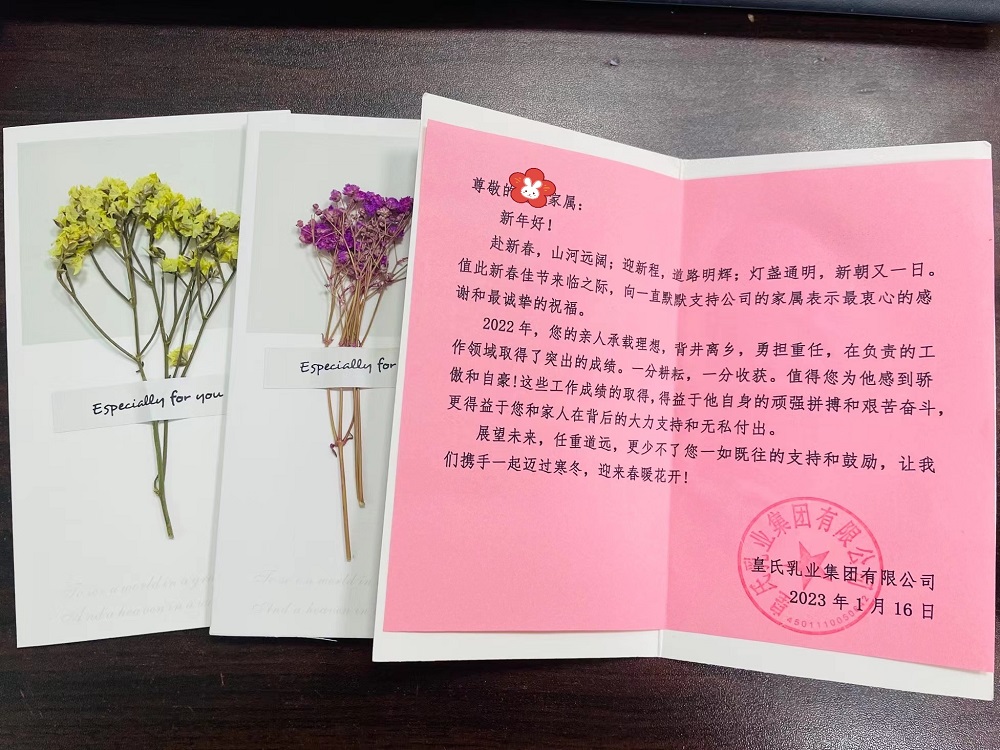 征途漫漫,共克时艰,牵手春天,纵情向前。皇氏乳业乐鱼网页版,乐鱼(中国)官方在线登录用真情和行动给予了外派员工家庭情感上的温暖及精神上的鼓励,让外派员工及家属在新春佳节来临之际感受到来自公司的关爱与温暖,用心用情构建起坚强的后方保障。未来,公司将持续完善人才管理体制机制,将发展成果最大程度惠及每位员工,切实提升员工幸福指数与获得感,构建企业高质量发展的人才支撑。